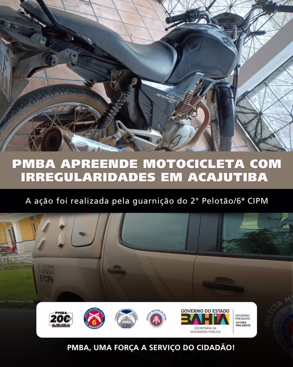 Uma motocicleta com sinais de adulteração no chassi e no motor foi apreendida pela Polícia Militar na manhã deste sábado (20), em Acajutiba. A ocorrência foi registrada durante uma ronda de rotina na cidade.