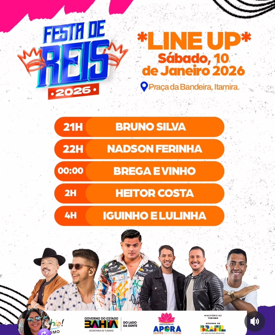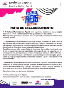 A Prefeitura de Aporá atualizou a programação da Festa de Reis 2026, realizada no distrito de Itamira, após o cancelamento do show do cantor Zé Vaqueiro, que estava previsto para este sábado (10). Segundo a gestão municipal, a mudança ocorreu por questões administrativas relacionadas a trâmites burocráticos junto ao Ministério do Turismo.